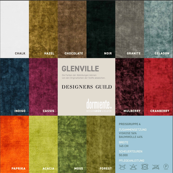 - Preisgruppe 4: DESIGNERS GUILD GLENVILLE / 56% Viskose 44% Baumwolle / 50.000 Scheuertouren / Lichtechtheit: 6 / Pillingwert: 4-5