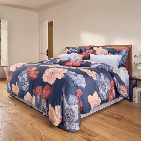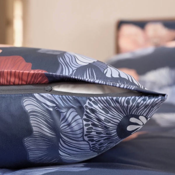 Sind Ihnen beim ausgedehnten Abendspaziergang schon einmal die vielen Mohnblüten am Wegrand und in den Feldern aufgefallen? Auf MONA fächern diese Mohnblüten ihre Blütenblätter wohlwollend auf und offenbaren damit ihre vielschichtigen, filigranen Blattadern sowie das typische, markante Blütenzentrum. Genau so einzigartig wie jede Mohnblüte ist auch die Handwerkskunst dieses handgemalten Bettwäsche-Designs: Die Linien der Blüten sind mit Tusche gemalt und anschliessend mit unterteilten Farbflächen ausgestaltet, wodurch das Design einen auffallenden Charakter erhält. Die Nuancen aus gedecktem Blau, elegantem Rot und zartem Puder kommen damit auf dem dunklen Fond besonders zur Geltung.