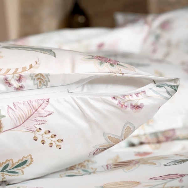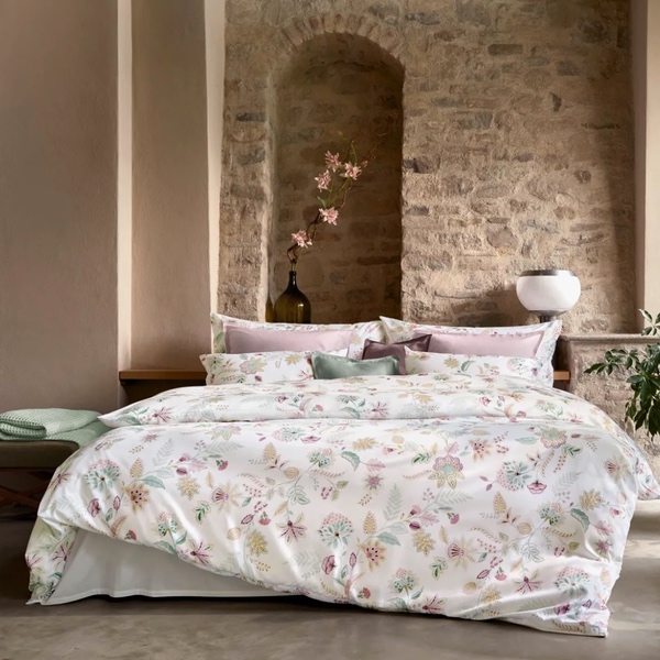 Wenn die tief stehende Sonne durch das offene Fenster bereits ihre Schatten wirft und sich eine warme Sommernacht ankündigt, dann gesellt sich mit IMA ein feiner Hauch von fernöstlichem Orient dazu. Diese klassisch ornamental anmutende Bettwäsche mit stilisierten Blüten und Blättern präsentiert sich in einer gedeckten, eleganten Farbstimmung aus Salbeigrün, Sandbeige, pudrigem Aubergine zusammen mit einem frischen Koralle-Akzent und lässt bestimmt jede Nacht von der nächsten Auszeit träumen.